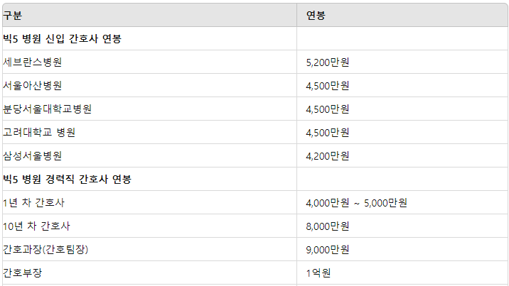 경력에 따라 연봉도 크게 달라집니다. 1년 차 간호사는 4,000만원에서 5,000만원, 10년 차 간호사는 약 8,000만원, 간호부장은 1억원에 이릅니다. 빅5병원은 워낙 유명하고, 현직자들의 전언(?)을 바탕으로 알려진 내용도 많아서 신뢰할 수 있는 수치인거 같습니다.