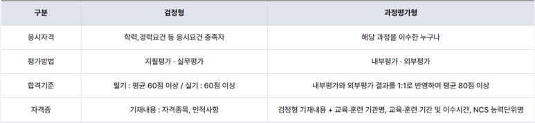 검정형이 지식과 시험 위주라면, 과정평가형은 실무 중심의 교육을 통한 발급이라고 생각하시면 돼요.