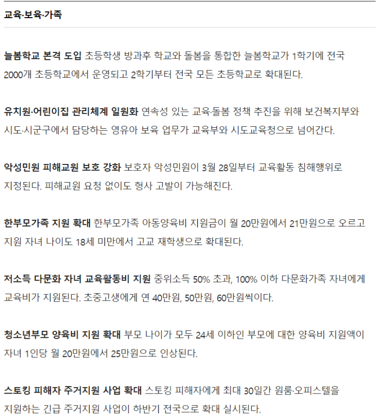 위 사진에 나와있는 것처럼 교육, 보육, 가족 관련 정책은 특히 오늘 주제와 직관되는 내용입니다. 첫 번째 줄에 있다는 것은 그만큼 시행할 의지가 높다는 것이겠죠. 전국 초등학교에 방과후 학교 및 돌봄을 통합한 늘봄학교를 2,000여 개 학교에서 시행 운영하며 2학기부터는 전국으로 확대하겠다는 것입니다. 실제 그렇게 될지는 지켜봐야겠으나 아무튼 필요한 내용은 맞습니다.