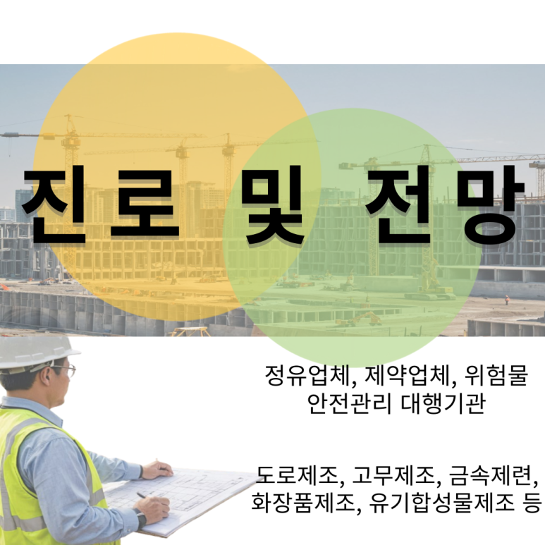 산업의 고도 성장에 따라 위험물의 수요와 종류가 많아지면서 위험성도 커지고 있습니다. 이에 따라 안전하게 위험물을 관리할 전문가의 수요는 계속 증가할 것입니다. 다양한 도료제조, 고무제조, 금속제련, 유기합성물제조, 화장품제조, 인쇄잉크제조 등의 업체와 정유업체, 제약업체, 위험물 안전관리 대행기관 등에서 취업이 가능합니다.