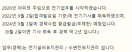 일단 전기 분야는 몸담게 되면 나아갈 수 있는 방향이 많아서 경험을 하면서 선택을 하면 됩니다. 물론 그 선택이 빠르면 빠를수록 좋긴 하죠. 그리고 선택했다면 ‘정확한 정보’를 파악하는 게 중요합니다. 이를테면 위 사진에 나와 있는 것처럼 중급 수첩을 달려면 자격증 취득 후 경력 2년이 필요하다 와 같은 것 말이죠.