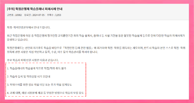 위 사진은 이번에 올라온 국가평생교육진흥원 플래너 피해사례 공지인데요. 학습설계를 인간이 하는 만큼 관련 문제가 많이 발생할 수 밖에 없습니다.