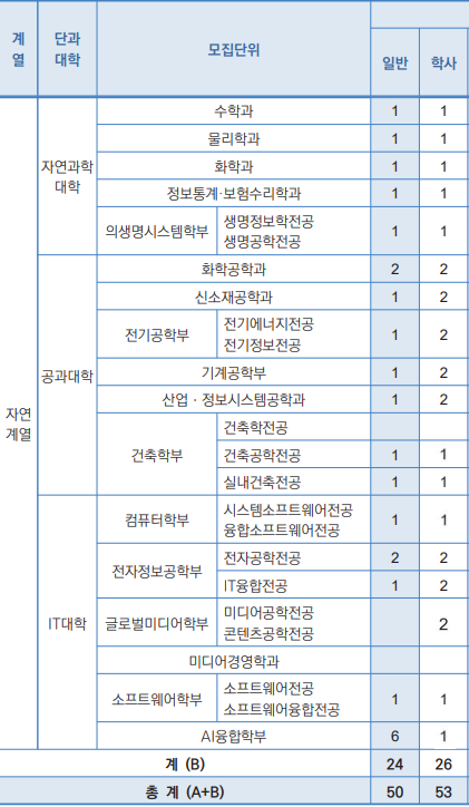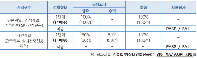 - 자연계·공과계열: 수학 필답고사 중심 (예: 컴퓨터학부, 전자정보공학부)