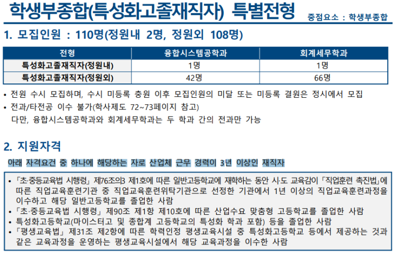 추가로 위 표를 보면 특성화고교졸업자, 특성과고교재직자가 구분돼있죠? 모집하는 전공이 다릅니다. 주간, 야간 수업 운영방식도 다르겠죠?