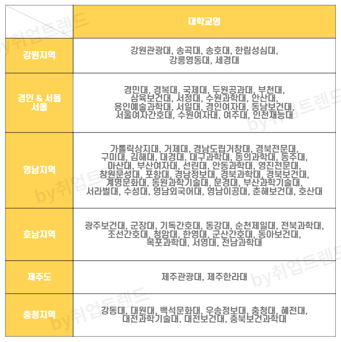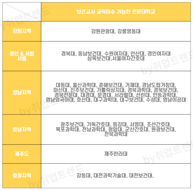 보건교사 임용고시를 보려면 보건교사 자격증을 취득해야 되는데 이건 특정 대학 간호학과에서 가능합니다. 흔히 ‘교직이수’라는 표현을 쓰는데, 해당 교과 과정을 운영하는 곳이 따로 있습니다. 앞에서 전국 리스트를 보셨죠. 그중에 있겠죠? 교직이수 가능한 전문대학 리스트를 따로 만들어 봤습니다.