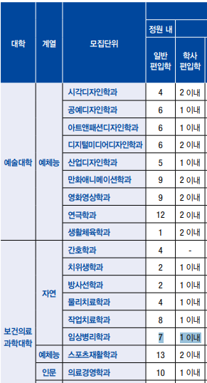 여기에 더해 일반편입으로 7명, 학사편입 1명, 의료인력양성 전형으로 4명을 모집하기 때문에 타 대학 대비 기회가 넓은 편입니다. 총 12명 선발, 꽤 많죠?