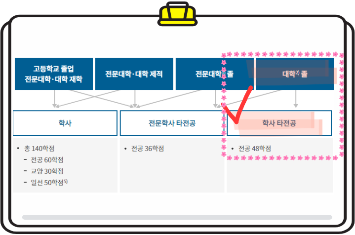 학점은행제를 통해 학사학위를 취득하는 방법을 알아보니, 4년제 대학을 졸업한 비전공자도 타전공 학사학위를 신청할 수 있다는 사실을 알게 됐어요. 기존 학사학위와 별개로, 전공 48학점을 채우기만 하면 새로운 전공의 학사학위를 취득할 수 있는 거죠.