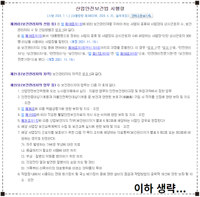 항상 함께 언급되는 국가기술자격이 있습니다. 산업안전보건법 시행령 별표 6에 따르면, 산업위생관리기사 자격증은 보건관리자로 선임되기 위한 자격 요건 중 하나입니다.