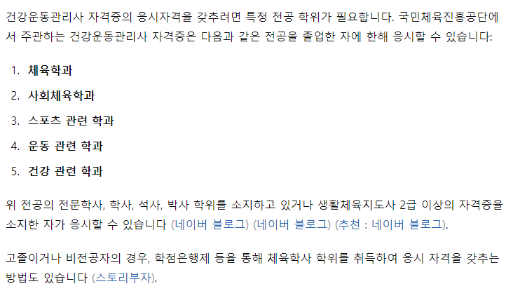 해당 전공 전문대 또는 4년제 졸업예정자부터 응시가능합니다. GPT 답변 말미에 학점은행제 관련 내용이 나오죠. 사회생활하면서 체육학과 관련 학위를 취득하는 방법 중에 효율적인게 학점은행제이고 따라서 각종 웨에 워낙 그 내용 위주로 나와 있으니 추천하고 있습니다.