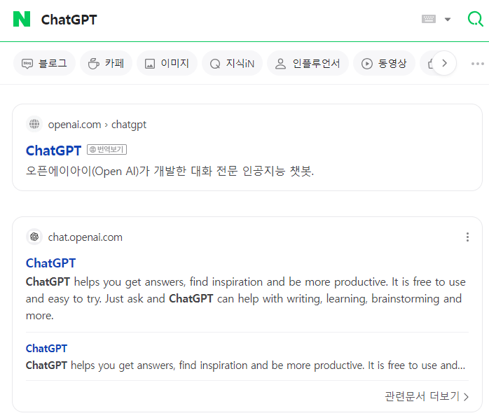 포털에 ChatGPT를 검색합니다. 그러면 위와 같이 chat.openai.com 웹사이트 주소가 뜰 텐데, 거기로 들어가야 됩니다. GPT를 만든 곳이 openAI라는 회사랍니다.