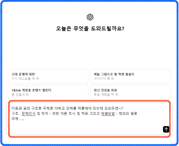 글의 구조와 주제 2가지를 반영한 프롬프트를 작성해 봤습니다. 여기서 추가적으로 외적인 요소(분량, 어조 등)을 요구하면 좋습니다.
